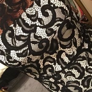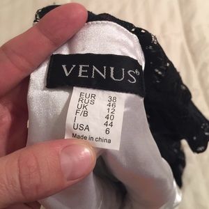 Super classy white with black overlay Venus dress. Sz 6. Fits Sz 4. Perfect. No snags or flaws. Very comfortable. Half sleeve. Almost knee length. Great for weddings or special occasions. V in the back. Scoop neck front.