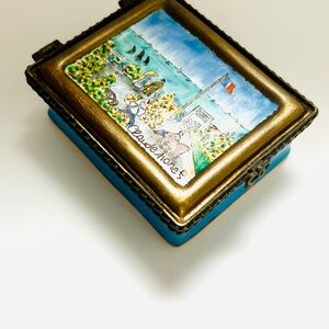 This is a gorgeous artwork trinket box. Made by Kelvin Chen in 2000. It is numbered 1165. This is a very unique trinket box and features a gorgeous Claude Monet painting. A very unique trinket box! Beautiful trinket box to put on display. The clasp is shaped like a flower. The details are gorgeous! Perfect for anyone who loves Monet or trinket boxes. This box has been refurbished on the top due to some paint chips with age. An excellent addition to any collection!