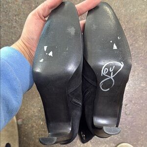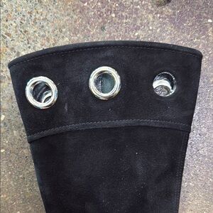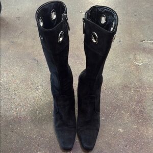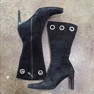 These sleek black heeled boots feature a sophisticated design with a glossy accent at the top, offering a chic and polished look. Crafted with a slim, fitted silhouette, they extend to a mid-calf to knee-high length, making them perfect for formal occasions. The rounded toe adds a touch of elegance, ensuring you step out in style. Approx 3 inch heel