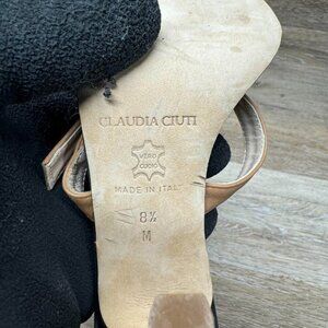 Elevate your shoe game with these stylish Claudia Ciuti pumps. These double ankle strap pumps feature a sleek brown/black color combination and a stiletto heel style that will add a touch of sophistication to any outfit. The open toe design and buckle closure make them easy to wear, while the leather upper material ensures durability and comfort. Perfect for any occasion, these pumps are a must-have for any woman's wardrobe. Whether you're dressing up for a night out or adding a touch of elegance to your work attire, these Claudia Ciuti pumps are sure to turn heads. Available in women's size 8.5, these pumps are a great addition to any shoe collection.