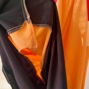 Fine sheer fuchsia pink top color block, satin-feel sheer cream, orange, and black color blocks. Polyester.