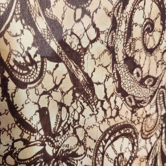 Claudia Richard half-sleeve, wide-neck, flowy tan blouse with swirl design. Some thread pulling (see pics). No size tag, appears large.