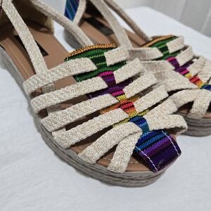 This is a pair of Claudia brand sandals. Women's size EU 38 US 7.5. They have a comfortable and cozy inner material with a fun and bright woven design around the heel and toes. The main color is tan with multi-brite colors intertwined. These are still like-new, never worn. Perfect for summer time, vacation, casual wear, school, etc. The Spanish written words on the inside translate to 'quality and softness.' Bohemian, minimalist, artisanal, etc.