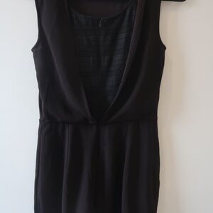 Effortlessly chic black romper by Claudie Pierlot, style “Jazz.” Features a flattering structured silhouette with a pleated skirt-like bottom and a daring deep V-back with tonal sheer paneling for a touch of edge. Made from a luxe blend of triacetate and polyester with cotton detailing. French size 36, fits like a US 0.