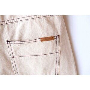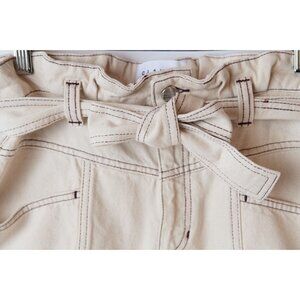 This Claudie Pierlot women's skirt is a size UK 40/Medium and features a straight and pencil style with a solid beige color and denim fabric. It has a zip closure and is suitable for various occasions such as travel, parties, and casual outings. The skirt includes pockets and a belt accent, adding a stylish touch to the design. Perfect for the summer season, this 90s-themed skirt is a versatile piece that can be paired with different tops for a fashionable look.