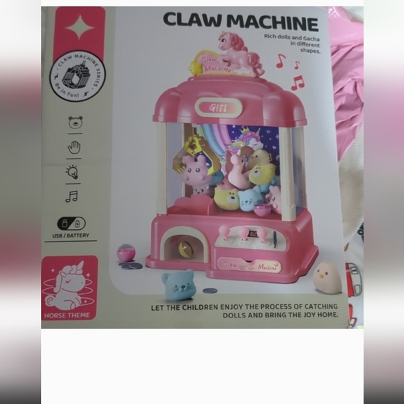 in this combo u get a mini version of the ever so addictive claw machine like we all have tried to win . This is a really cute gift for any child or even adult. I have given one to a child and an adult and filled it with their favorite items for prizes.