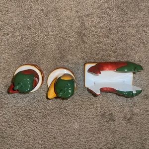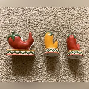 Spice up your dining table with this set of three Jalapeño Pepper shaped salt and pepper shakers and a napkin holder from Clay Art. The rustic design and multicolor pattern make it suitable for all occasions and add a Southwestern touch to your kitchen.