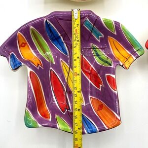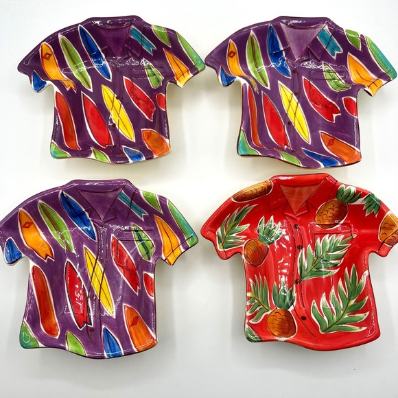 Eye-catching set of 4 ceramic trinket dishes shaped like Hawaiian shirts. These vibrant dishes feature unique designs: one with colorful surfboards on a purple background, and another with a lively pineapple and palm leaf pattern on a red background.