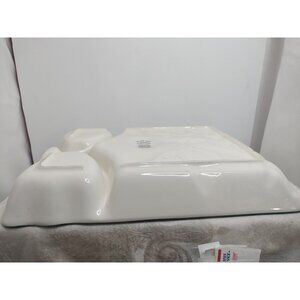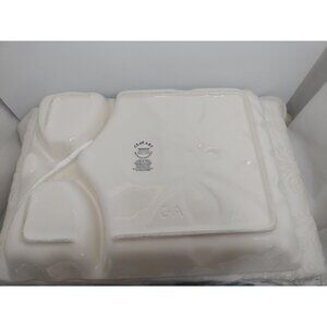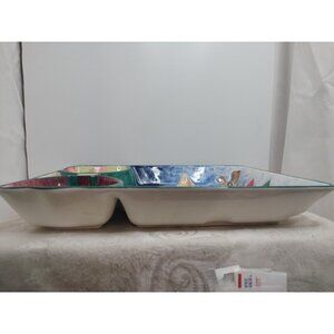The Clay Art Reindeer Chip 'n Dip Platter is a festive and functional addition to your holiday table. Made of ceramic with a glossy finish, this large rectangular tray features four compartments for chips and dips, with a colorful Christmas theme. The intricate reindeer design adds an artistic touch to your serving, making it a standout piece for your Christmas gathering. At 15"1/4 in length and 11"1/2 in width, this Clay Art platter is both practical and stylish for serving up your favorite snacks during the holiday season.