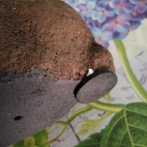 Pre-owned clay sitting up rabbit. Please see photos for overall condition, wear & tear. The photos are part of the description. Small white spot near bottom-tail and a small spots on underbelly. Approx. size: 4 3/4" tall x 2 1/2" deep x 1 3/4 " wide. Needs cleaning - will leave method and extent to knowledgeable new owner. Has been in a display cabinet for years. Smoke free home.
