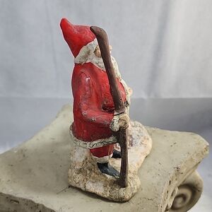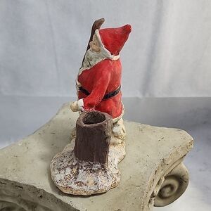 Santa on his mindful walk through the forest. Clay figurine has an open stump with 3/4" diameter measurement. Great place for an l.e.d. taper candle, some greenery, or a faux succulent.