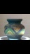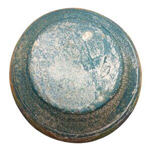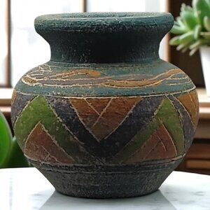 Small, round clay/pottery vase with a textured, distressed finish, primarily in a turquoise or teal color. Item is 4'' H x 3'' D top/mouth.