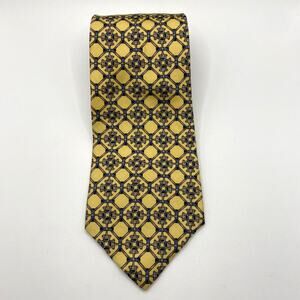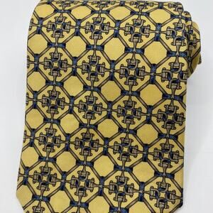 Claybrooke Men's Pure Silk Tie Necktie in Yellow and Navy interlocked horseshoe clasps with octagons and squares pattern.