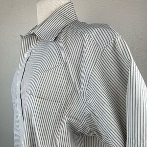 Great light and dark gray striped design on this classic button down shirt. It measures 24 inches across the chest laying flat and 31 inches in length from shoulder to hem.
