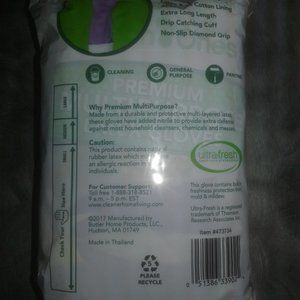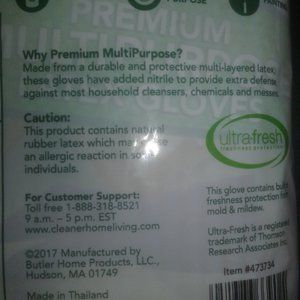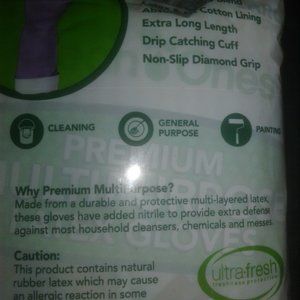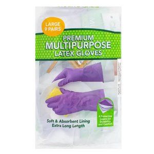 Premium Multi-Purpose Gloves Latex and nitrile blended material Medium 9 pair More Information: Household reusable gloves Extra-long 13-3/4" length Ultra-soft cotton flock lining Tailored fit Super gripping diamond pattern Phthalate and BPA free Thick 20 mil heat-resisting material This product contains natural rubber latex which may cause allergic reaction in some individuals