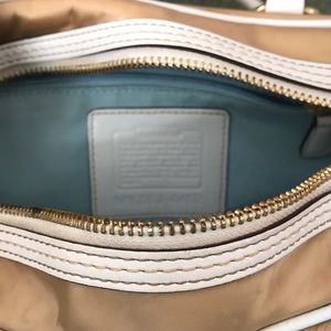 Gold/White Coach satchel. Some color discoloration. Scratches on bottom. Open 2 best offer