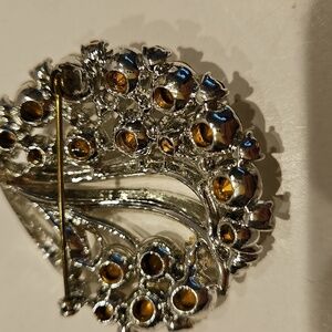 Clear & 1 Purple Rhinestone Silvertone Brooch.This stunning brooch features a silvertone and adorned with sparkling crystals. Perfect for adding a touch of elegance to any outfit.