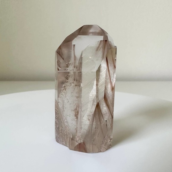 Beuatiful clear Amphibole Quartz tower with a lot of clarity and some fibrous peachy red inclusions. Uniquely faceted.