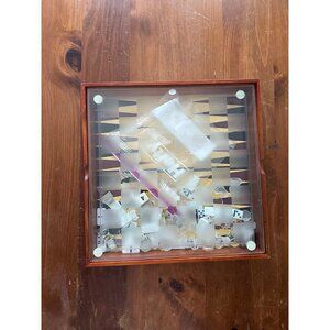 Clear And Frosted Chess Checkers and Backgammon Set In Wooden Box Glass Board