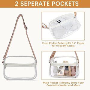 Perfect Size For Daily: Clear purses size is 10.2" x 2.3" x 6.8". The crossbody bag has a Center Zipper Main Compartment + 1 Long Front Zip Pocket, Roomy enough for you to allocate space to put your phone, wallet, cosmetics and snacks. Convenient Front Pocket helps you hold small things for easy or frequent access daily