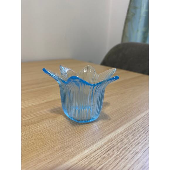Clear Blue Glass Ribbed Tulip Candle Holder VINTAGE