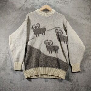 Clear Blue Yonder Sweater Mens Medium Tan With Rams Pure New Wool Cabincore