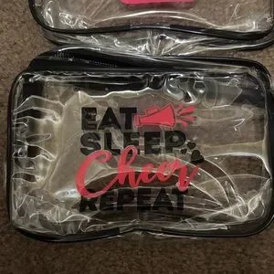 Set of clear pouches with cheer-themed designs. Features black trim and bold text in black & hot pink writting. 7 bags total.