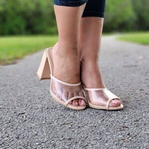 Open Toe Clear Chunky Block Mid Heel Mule Sandals Nude Color