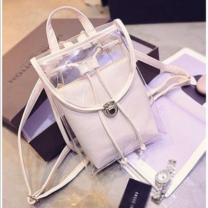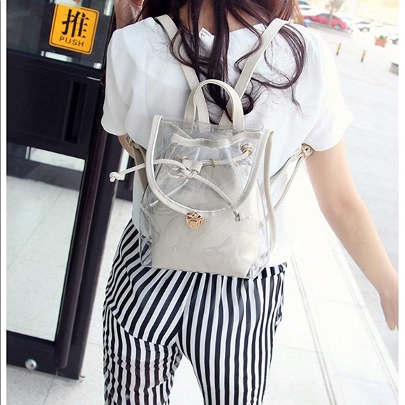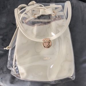 Off white with Rose Gold accents. This is great for festivals or jobs that require clear bags! The pouch inside can be removed so that bag is completely clear.