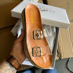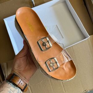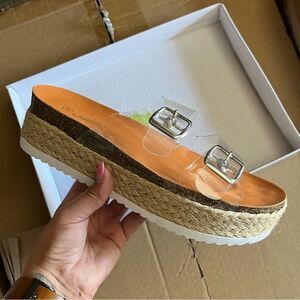 Great espadrilles, there is a clear upper double buckle super soft transparent PVC material. The platform will you give a little lift.