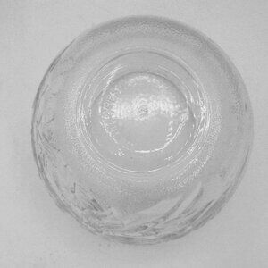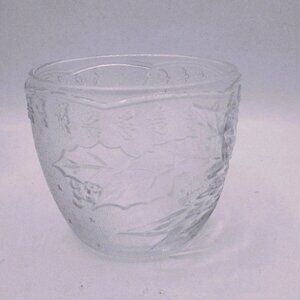 This clear etched glass vase features intricate floral and holly designs, adding a touch of elegance to any decor. Ideal for flower arrangements or as a decorative piece.