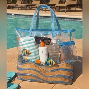 Make a splash with this playful clear vinyl (PVC) beach tote featuring a bright tropical “under-the-sea” print—angelfish, clownfish, shells, starfish and bubble dots. The base has three wavy, sealed channels filled with sand for a fun beach-on-the-go look. Lightweight and wipe-clean with a top zipper, sturdy shoulder straps and a matching detachable clear zip pouch for sunscreen/keys.