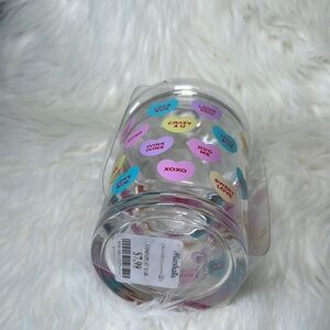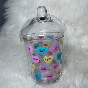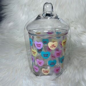 Clear glass candy jar featuring colorful heart designs with messages. Perfect for storing treats or as a decorative piece. Box 3N