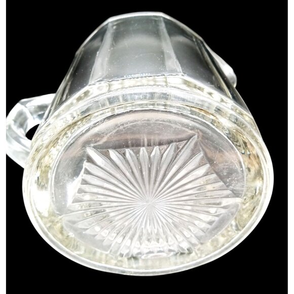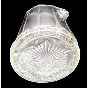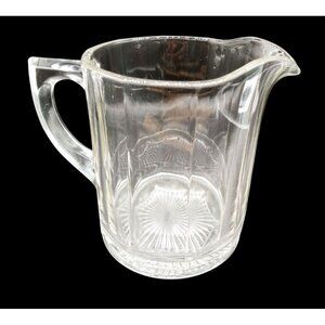 Intricately designed by Indiana glass with a classic sunburst pattern on the bottom, this vintage squat glass pitcher adds elegance to serving beverages. Its sturdy handle ensures a comfortable grip and the transparent design complements any table setting. Ideal for collectors or for enhancing your dining experience with a touch of vintage charm.