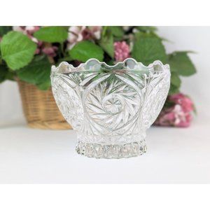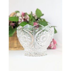 Cute vintage round clear pressed glass small bowl with a pedestal bottom and eastern star motif. The small bowl has a lovely scalloped edging and measures approximately 5.5" wide at its rim and stands 4" tall. The thick glass bowl is hefty. The bowl would be perfect as a small candy dish at a dinner party, as a vanity bowl catching earrings and rings on a dresser, or on a small foyer table to catch keys and change. Would also be a cute soap holder in a guest bathroom. The bowl is in excellent vintage condition with no chips, cracks or scratches. Display worthy. Gift worthy.