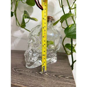Unique clear glass bottle shaped like a skull, complete with a cork stopper. Perfect as a decorative piece, collectible, or creative container for display and storage.