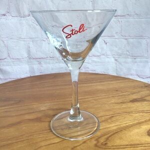 Elevate your dining experience with this stunning set of Stoli martini glasses. Each glass boasts a classic V-shaped bowl and a long, graceful stem, ideal for serving sophisticated cocktails. The Stoli logo is in a vibrant red hue. Perfect for elegant gatherings, these glasses bring a touch of luxury to any occasion. Each glass measures approximately 6” tall, 3 3/4” in diameter at the rim. Great condition. No chips, cracks or repairs. Smoke free home.