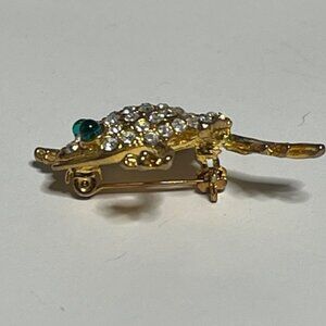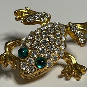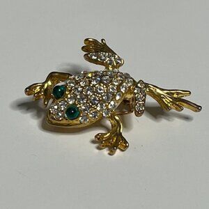 Clear Green Rhinestones Gold Tone Leaping Frog Brooch Pin 1.25"