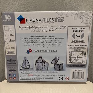 This is a 16-piece magnetic construction set from Magna-Tiles, part of their Ice Set collection. The set is designed for children aged 3 and up, featuring clear tiles in the original magnetic design. Perfect for creative building and imaginative play.