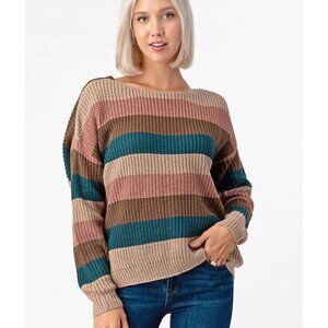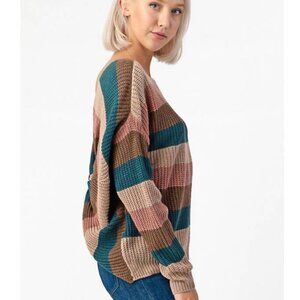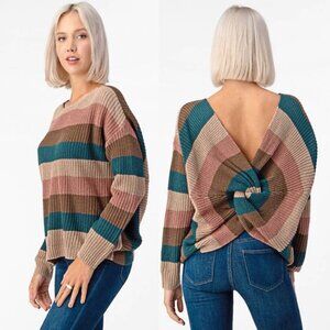 "Love this twist back sweater with all neutral colors and a pop of teal! Wear twist in front or back, day or night! Options are unlimited with this unique sweater.