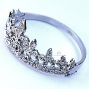 Clear Pave Cubic Zirconia Fleur-de-Lis Princess Crown Hinged Cuff Bracelet 7.5"