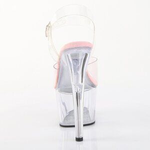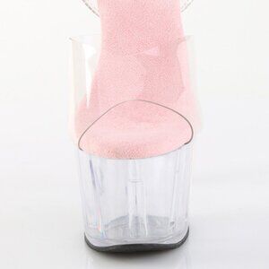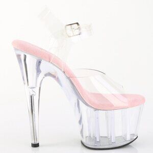 Elevate your look with these stunning clear platform heels, perfect for pole dancing, exotic dancing, and nights out on the town. Featuring a bold 7" heel and a comfortable 2 3/4" platform, these transparent stiletto sandals offer a chic, leg-lengthening effect. The lucite design and clear ankle strap create a barely-there illusion, making them a versatile statement shoe for any occasion, from bikini competitions to a glamorous party. These trendy and elegant heels are a must-have for dancers and fashion enthusiasts alike. Clear and Light Pink Insole.