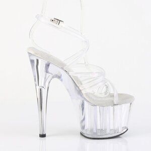 Elevate your style with these stunning clear strappy platform heels. Designed for a bold and confident look, these shoes are ideal for pole dancing, exotic dancing, and special events. The transparent design and elegant stiletto heel create a leg-lengthening silhouette. Featuring a dramatic 7” heel and a 2 3/4” platform, these high heels offer both style and a secure fit.