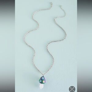 This adorable magic mushroom pendant necklace includes a genuine piece of rough-cut quartz crystal as the stem.
