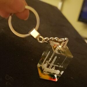 Clear rectangular keychain featuring a colorful base with red, green, and yellow accents.