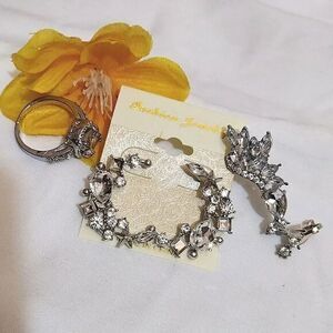 Clear Rhinestone 3 Piece Formal Earrings, Ear Cuff and Ring Set NEW