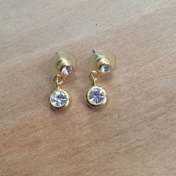 Clear rhinestone dangle earrings in gold tone setting. Measures 1" in length.