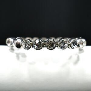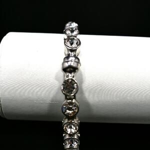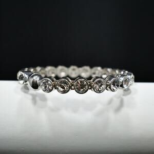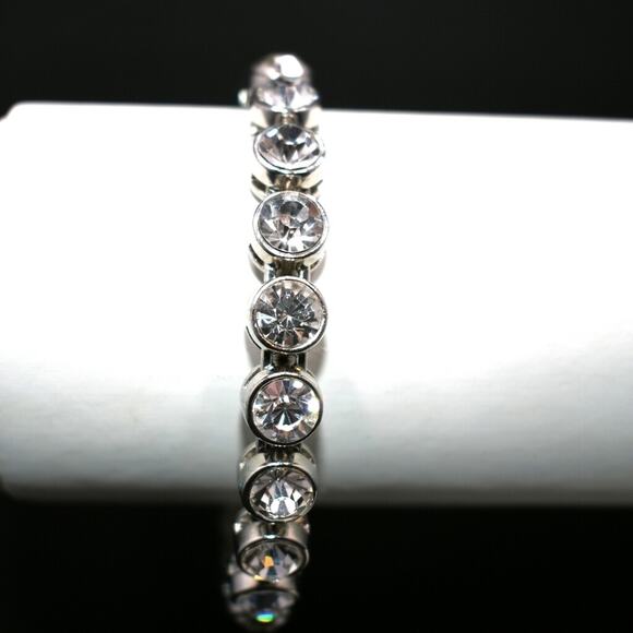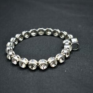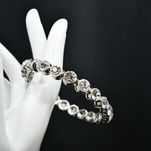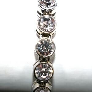 This is a beautiful headlight clear rhinestone magnetic clasp bangle bracelet in silver tone. The bangle is 7 1/2 inches around the inside. The width is 3/8 inch. It is Pre-loved in great condition.