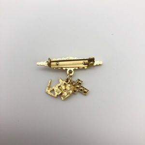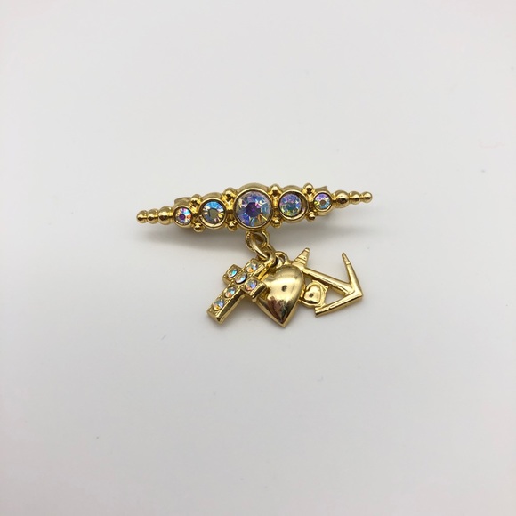Cute aurora borealis rhinestone pin in gold tone setting. Features three little charms (cross, anchor, and heart) hanging from the center. Measures 1.75" across.