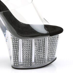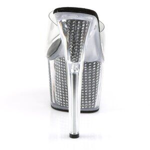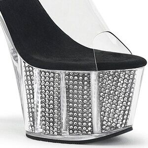 Step into the spotlight with these dazzling clear platform mules. Designed to make a statement, these high heels feature a 7-inch stiletto heel and a 2 3/4-inch platform, providing a dramatic lift. The clear platform is filled with shimmering silver rhinestones that catch the light with every move, while the black suede footbed offers a striking contrast. A clear strap keeps the foot secure, creating a bold, transparent look. Perfect for a night out, exotic dance, or any occasion where you want to add a touch of glamour and sparkle.